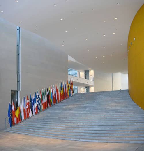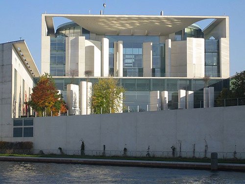 Plus grand bâtiment gouvernemental au monde avec une surface de 19 000 mètres carrés, la nouvelle chancellerie, achevée en 2001, est l’un des grands symboles architecturaux de la capitale fédérale réunifiée. Au quatrième niveau de ce bâtiment gigantesque, surnommé « la machine à laver » en raison de la découpe du béton et des pans vitrés en façade, se situe l’étage dit « confidentiel », un espace entièrement confiné et dédié aux réunions des cellules de crise. Si Angela Merkel a choisi de rester dans son appartement de l’île des Musées plutôt que de s’installer à la Chancellerie, c’est sans doute en raison de la taille réelle de l’appartement du chancelier, de vingt-huit mètres carrés seulement une fois tous les espaces de réception déduis !