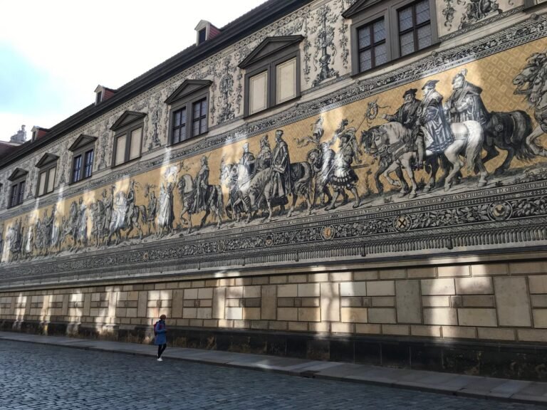 Cette impressionnante fresque murale longue de 101 mètres représente l’histoire des Wettin, la dynastie qui régna sur la Saxe pendant plusieurs siècles. Elle est accessible gratuitement et se trouve sur la partie extérieure du mur encerclant l’ancienne cour des écuries. Le Fürstenzug (cortège des princes) est réalisé entre 1872 et 1876 par Wilhelm Walther à l’occasion des 800 ans de la maison princière de Wettin. La technique originalement utilisée est celle du sgraffite. Elle consiste à graver un dessin dans un enduit encore frais pour faire apparaître l’enduit inférieur. Menacée par les intempéries, l’œuvre est finalement transférée sur du grès cérame de Meissen pour assurer sa préservation sur le long terme. Sur les 24 000 carreaux, on observe les 35 margraves, électeurs et rois qui ont régné sur la Saxe. Ils sont entourés par une soixantaine d’autres personnages : artisans, agriculteurs, artistes, scientifiques… A découvrir tôt le matin pour ne pas être gêné par la foule !
