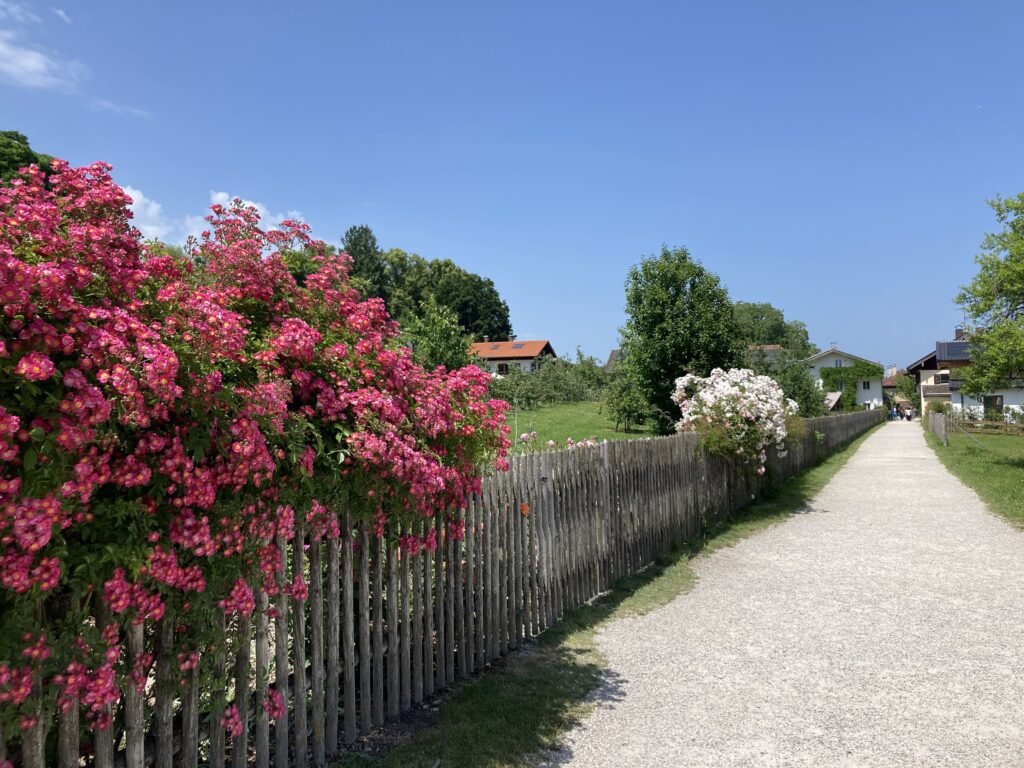 Voici une idée de promenade d’environ 8 kilomètres pour découvrir le lac. Rendez-vous à la station Possenhofen accessible en S-Bahn. Traversez le village du même nom pour rejoindre le sentier au bord du lac. Vous verrez le château de Possenhofen, ancienne résidence d’été de l’impératrice Élisabeth de Bavière, plus connue sous le nom de Sissi. Suivez le sentier en direction de Tutzing. Principalement piétonnier et dans la verdure, il borde en grande partie le lac et offre de nombreuses possibilités de baignade, notamment une plage aménagée payante : la Strandbad Feldafing. Il y a quelques options pour se restaurer, mais les établissements peuvent être fermés hors saison. Prévoyez suffisamment d’eau et des snacks. A mi-chemin, un ferry vous permet de rejoindre l’île Roseninsel. L’île aux roses est un bel endroit de promenade. Au centre se dresse un petit château néo-classique, construit au 19e siècle par Ludovika de Bavière, mère de l’impératrice Sissi, comme résidence d’été. Il abrite aujourd’hui un petit musée. En vous approchant de Tutzing, le côté nature disparaît un peu et les bords du lacs sont plus aménagés. Vous y trouvez des restaurants, des magasins, des installations sportives, des bateaux qui traversent le lac et le train pour rentrer à Munich.