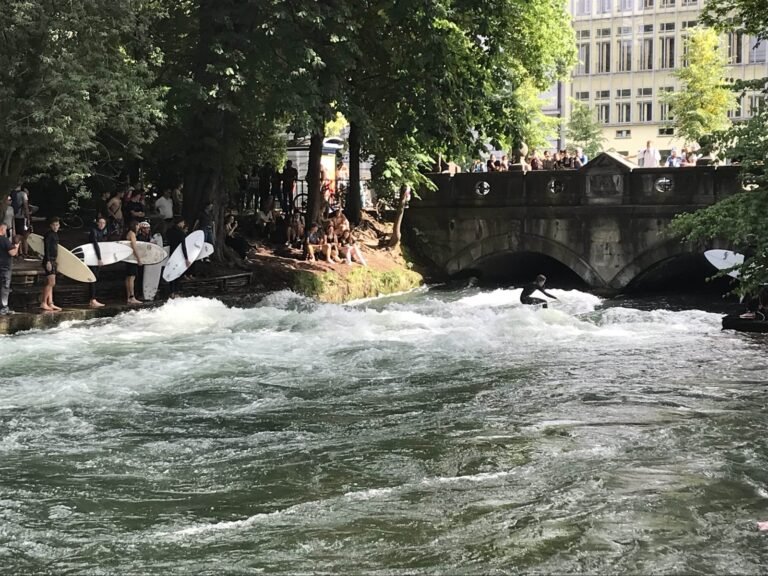Le jardin anglais est traversé par la rivière Eisbach. En été, des surfeurs affrontent les uns après les autres la vague sous le pont Eisbach Brücke. Pour le plus grand plaisir des flâneurs ! Les habitants n’hésitent pas non plus à plonger dans la rivière et à se laisser porter par son fort courant. Certains prennent même le tramway, trempés et en maillot de bain, pour revenir au Eisbach Brücke et sauter de nouveau dans l’eau. La baignade et la pratique du surf sont toutefois officiellement interdites pour des raisons de sécurité.