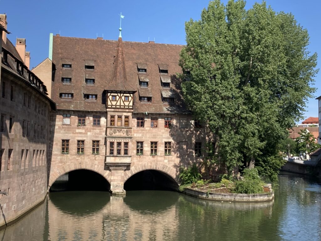 Traversez la jolie et minuscule Liebesinsel (île de l’amour) pour découvrir l’autre partie du centre historique, notamment la place principale (Hauptmarkt) qui accueille tous les ans le marché de Noël renommé de Nuremberg. Vous pouvez ensuite entrer dans la cour de l’hôpital du Saint-Esprit (Heilig-Geist-Spital). Ce bâtiment du 14e siècle enjambe élégamment la rivière. Il est aujourd’hui utilisé comme résidence pour personnes âgées.