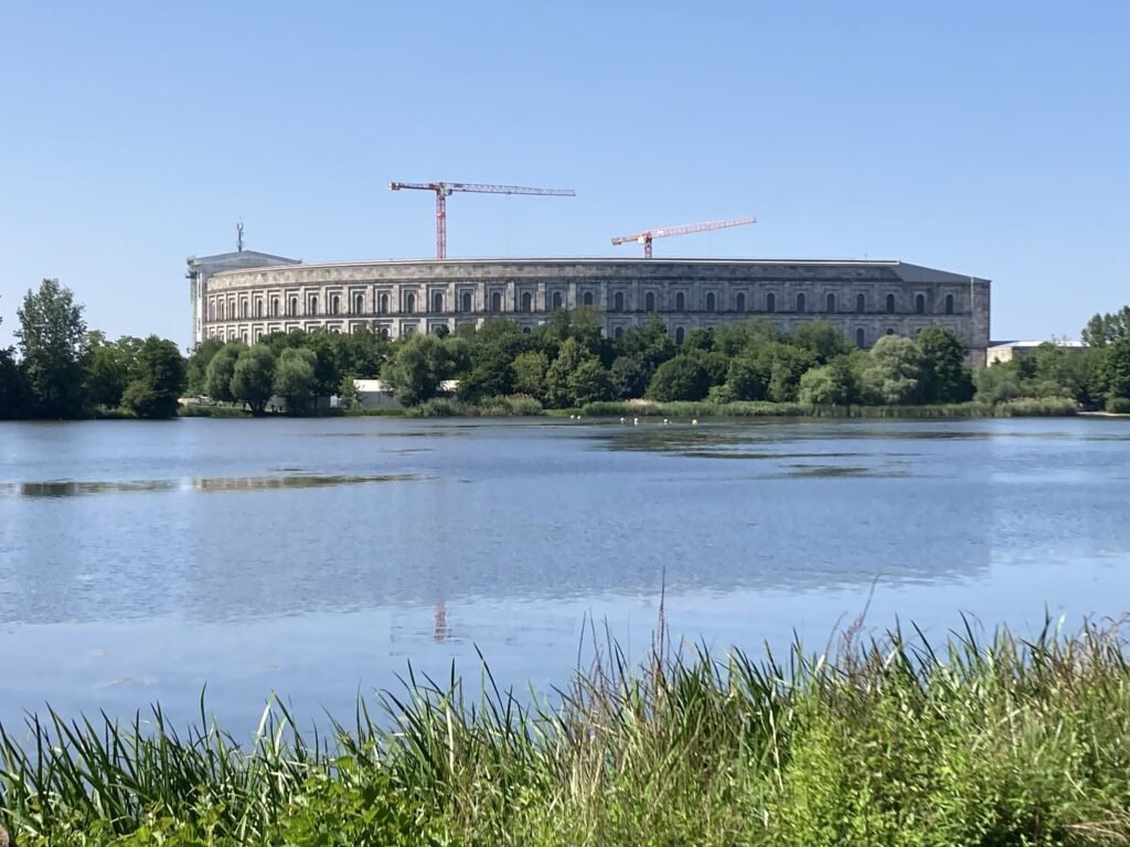 Plus loin, vous découvrez la tribune Zeppelin où siégeaient Adolf Hitler et les hauts dirigeants nazis lors des rassemblements du parti. Cette structure impressionnante n’est pas accessible. Protégée par des barrières, elle est également en cours de réfection.