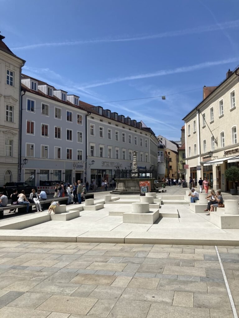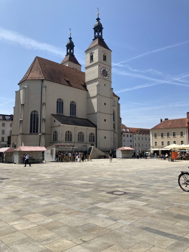 Conçue pour être une église catholique, elle devint, faute de financement, une église protestante. Elle fut construite dans l’ancien quartier juif de la ville, à la place de la synagogue. Au Moyen-âge, 300 Juifs habitaient à Ratisbonne, soit l’une des communautés les plus importantes de l’Empire. Mais le 21 février 1519, ils sont expulsés sur ordre du Conseil municipal. Le quartier et la synagogue sont rasés. Le mémorial “Ort der friedlichen Begegnung – Misrach” (lieu de rencontre paisible) a été créé en 2005 par l’artiste israélien Dani Karavan. Il est situé sur les fondations de l’ancienne synagogue, devant l’église Neupfarrkirche. C’est effectivement un espace convivial où se rencontrent et se reposent les habitants.