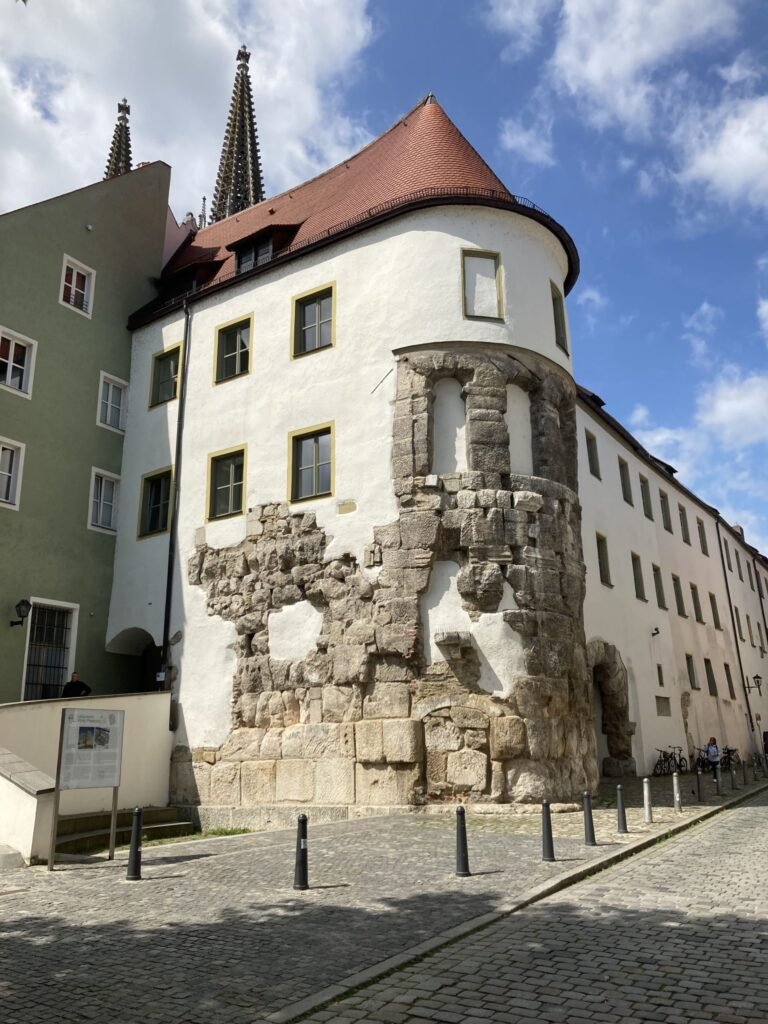 Un premier camp romain fut établi en 79 après J-C, un peu au sud de la ville actuelle, mais il fut rapidement détruit. En 175, Marc Aurèle décide de la construction en pierre d’un nouveau camp, appelé Castra Regina, qui deviendra au fil des siècles la ville de Ratisbonne. Il était protégé de murs élevés et de tours de garde. Plusieurs portes permettaient l’accès à l’enceinte du camp. Vous pouvez encore admirer la Porta Praetoria, intégrée dans un édifice du Moyen-âge, derrière la cour de l’évêché. Un pan de 60 mètres du mur est aussi préservé en contrebas de la Dachauplatz, au “document Legionslagermauer”. Sur la place Ernst-Reuter, l’angle sud-est du mur est en accès libre et en plein air.