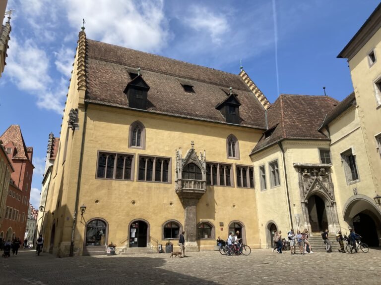 Ce bâtiment, construit au milieu du 13e siècle sur le modèle des maisons patriciennes, comporte aussi une tour de 55 mètres. Détruite par un incendie en 1360, elle fut reconstruite en 1363. L’hôtel de ville fut à partir de 1663 et jusqu’en 1806 le siège permanent de la Diète d’Empire. La Diète était une sorte de réunion des princes impériaux qui dirigeaient les différents États de l’Empire.