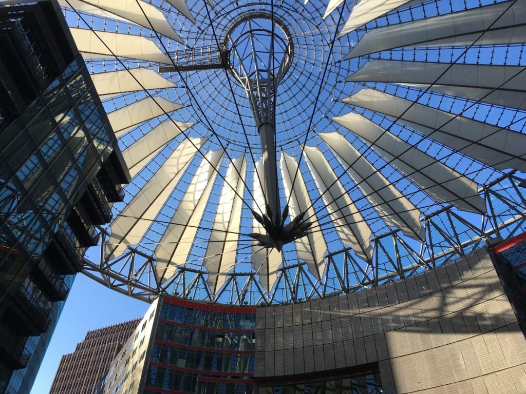 Suivez votre guide dans le quartier de Potsdamer Platz. La reconstruction de cet immense No man’s Land, principalement financé par des fonds privés, a été planifiée comme un projet global mélangeant bureaux, commerces, divertissements et habitations.
