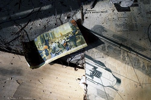 Nous marchâmes des heures à travers les hautes herbes balayées par le soleil, parcourant les escaliers des immeubles toujours identiques, en général totalement vides et délabrés. Une pause dans les sous bois s’imposait. Nous pensions qu’une fois 17h passée, la caserne serait à nous, les ouvriers étant censé terminer leur journée à cet horaire. Mais les aller-retour des camions ne cessaient pas, de même que les échos de démolition. C’est donc prudemment qu’il fallait progresser en leur direction, car c’est là que se trouvaient les bâtiments les plus intéressants.