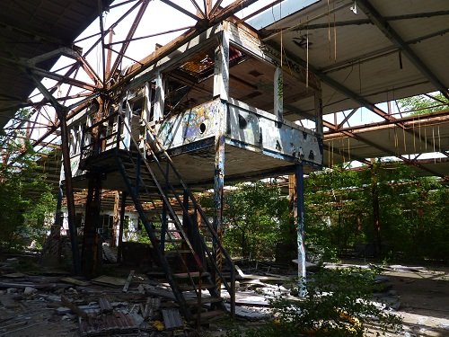 Je ne fus pas déçue d’entamer ce nouveau voyage, cette fois-ci en compagnie de B. et de F, créateur d’univers pour des films et des jeux vidéos venu chercher l’inspiration. Là encore l’entrée fut un jeu d’enfants. Je suivais le même chemin que la dernière fois mais nous aurions tout autant pu passer par le portail principal grand ouvert. Un toit continuait de s’effondrait et depuis l’hiver dernier les graffitis avaient été remplacés par de nouvelles oeuvres. Mas cette fois-ci, la star de l’entrepôt, c’était la verdure. L’opposition nature/industrie était à son comble. Le vert tendre émaillait l’espace gris. Nous nous promenions dans la forêt et nous perdions parfois, tombant nez à nez avec une sorte de cage en ferraille digne de décorer le Kit Kat Club, ou encore une chaise oubliée, ou même un couple en goguette sur leur vélo. Je voyais déjà mes deux fans de jeux vidéos sursauter, imaginant des chasseurs en fraction derrière un arbre, ou des soldats américains perdus qui n’auraient pas été au courant de la fin de la guerre du Vietnam.
